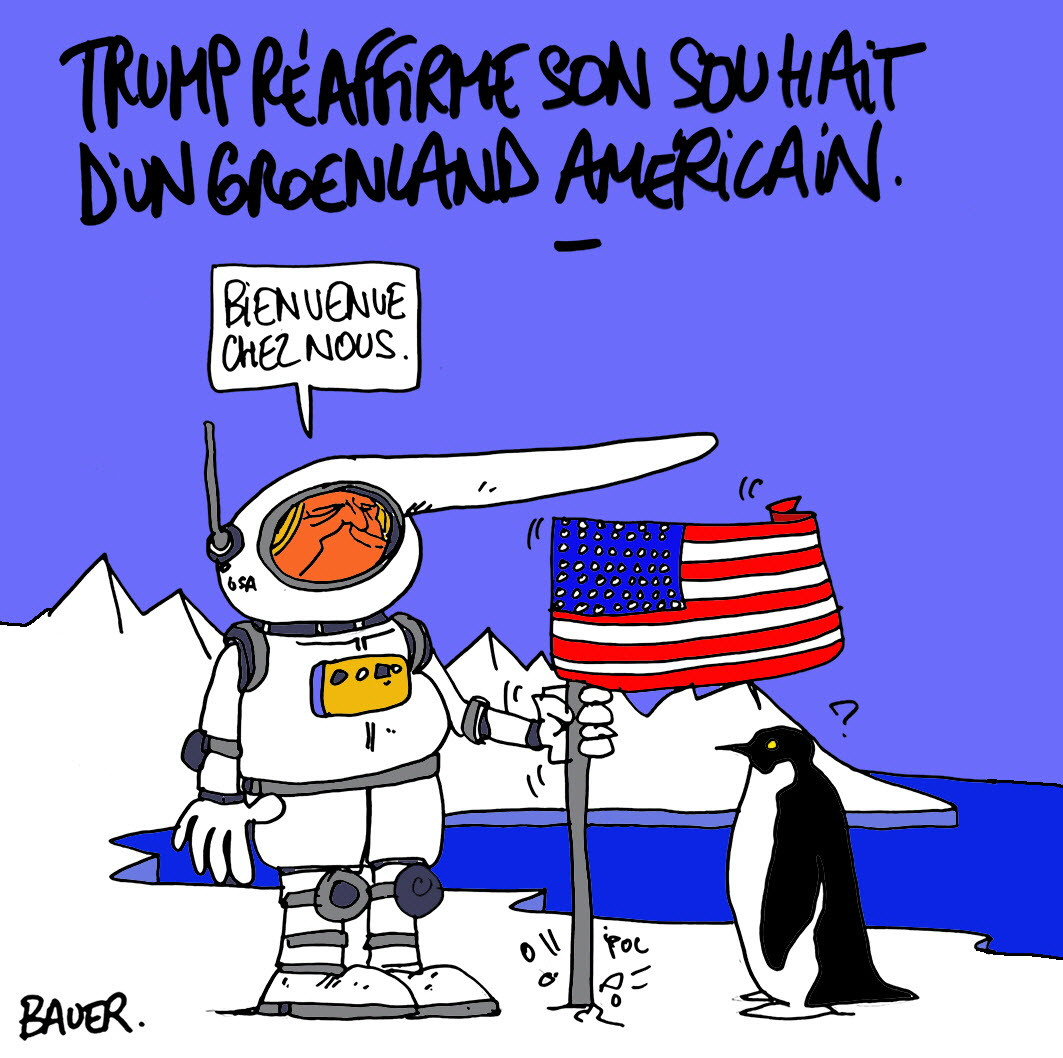 (Rajz: Bauer; forrás: Le Progrès.fr. A szövegbuborékban: "Isten hozott nálunk") |